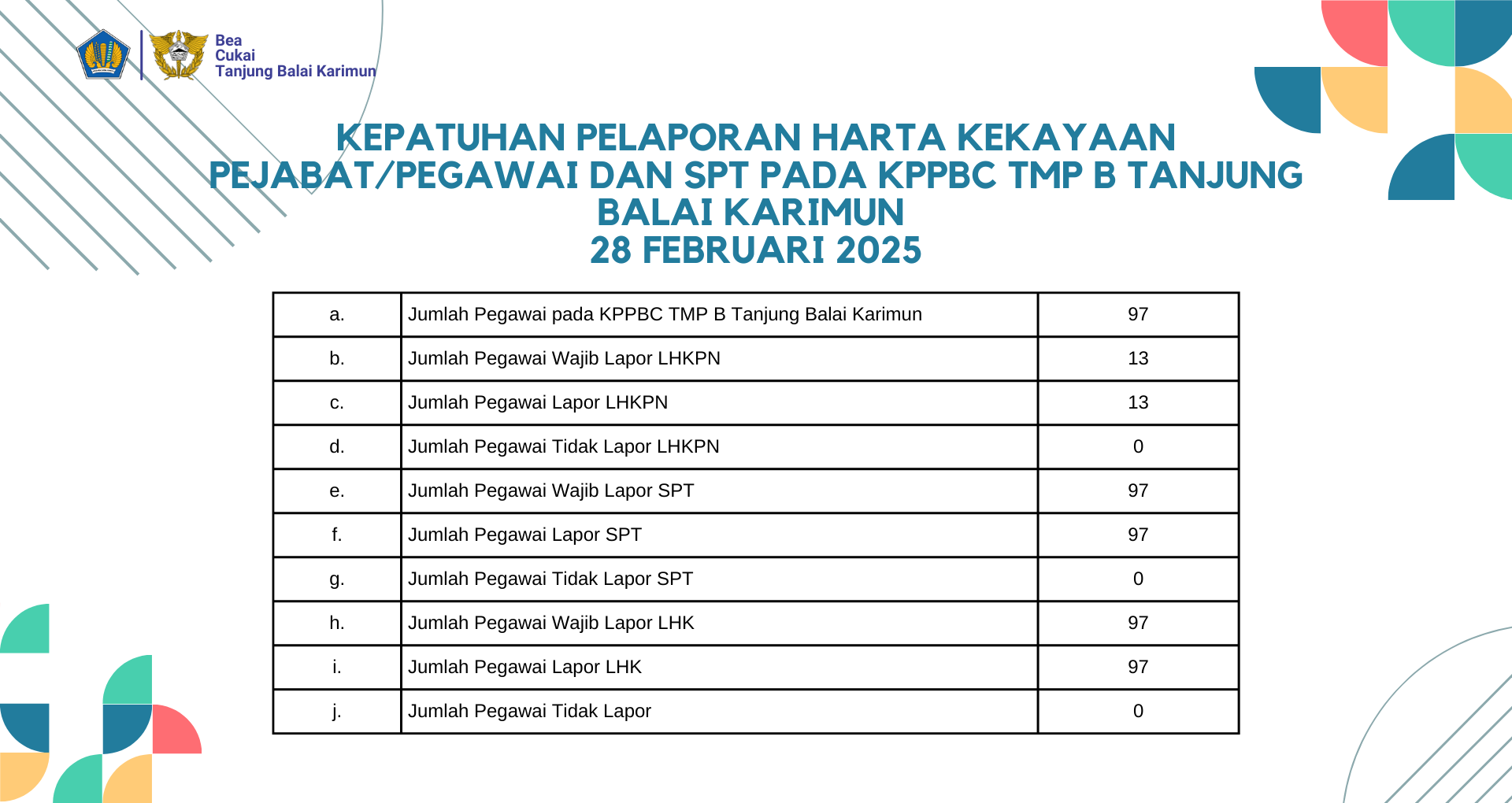 Kepatuhan Pelaporan Harta Kekayaan Pejabat/Pegawai Dan SPT Pada KPPBC TMP B Tanjung Balai Karimun Periode Hingga 28 Februari 2025 dapat dilihat di sini